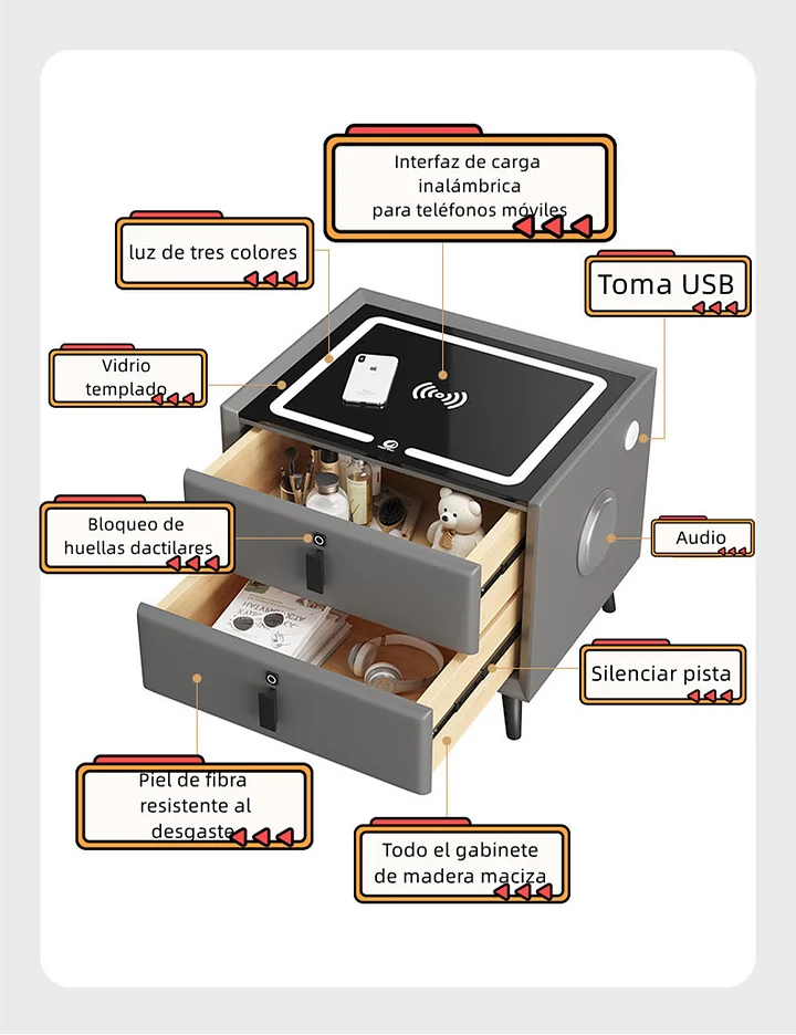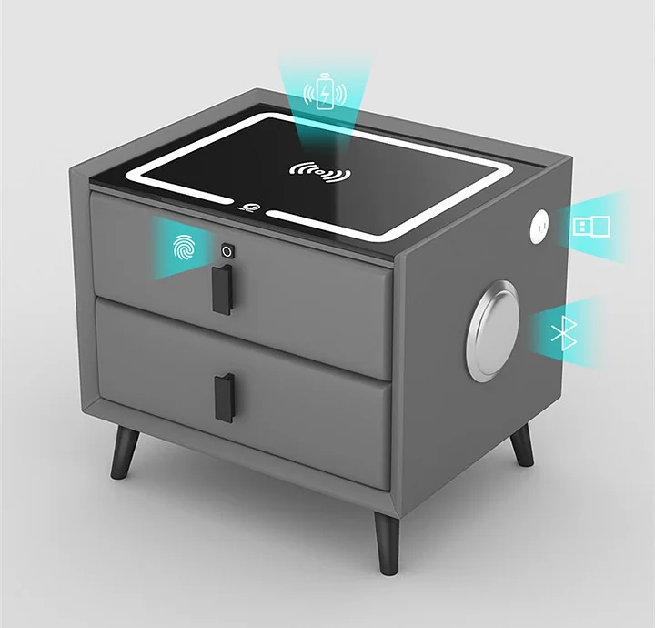 Nova atualização, USB, carregamento sem fio, luz noturna, trava de impressão digital, alto-falante dente azul como mesa de cabeceira inteligente.
