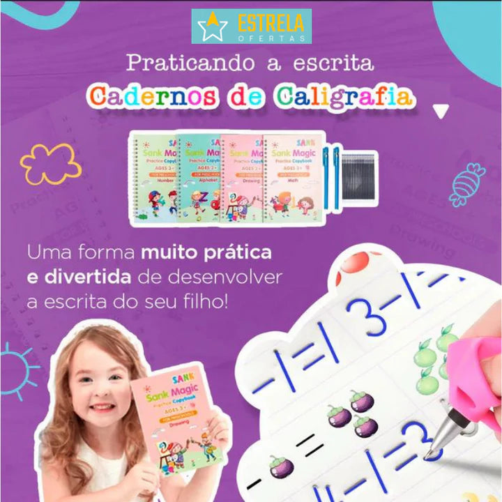 A tinta das canetas possui uma tecnologia que faz a tinta desaparecer em alguns minutos! Incentivando as crianças a praticarem novamente e você também economizará com cadernos de caligrafia. Os cadernos poderão ser reutilizados diversas vezes. A diversão estará garantida por um longo prazo!
