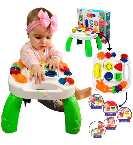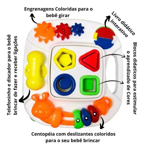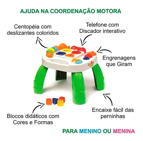 Mesa excelente para estimular o aprendizado, coordenação motora e desenvolvimento de seu bebezinho, pois ela vem com blocos didáticos para estimular o aprendizado de cores e formatos brincando, além de centopeia com deslizantes coloridos, livro interativo colorido, engrenagens coloridos e telefoninho discador para seu bebê brincar de ligações. Mesa didática feita para o desenvolvimento e aprendizado de seu bebê.