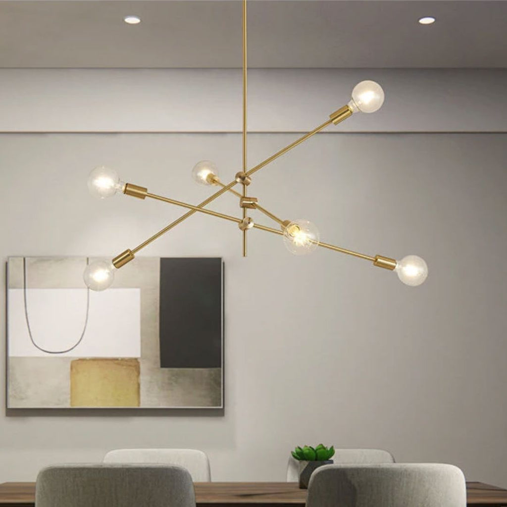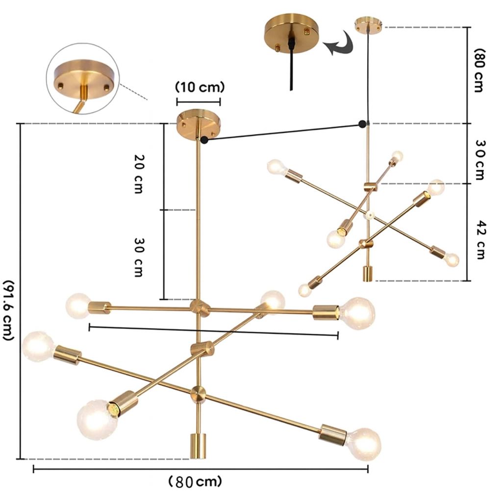 Inspirado no design icônico do estilo Sputnik Mid-Century, esta luminária traz linhas geométricas sofisticadas e estrutura metálica dourada que valoriza a iluminação e a decoração. Compatível com lâmpadas LED ou incandescentes, seu formato aberto garante ampla difusão de luz, tornando o espaço mais aconchegante e imponente.