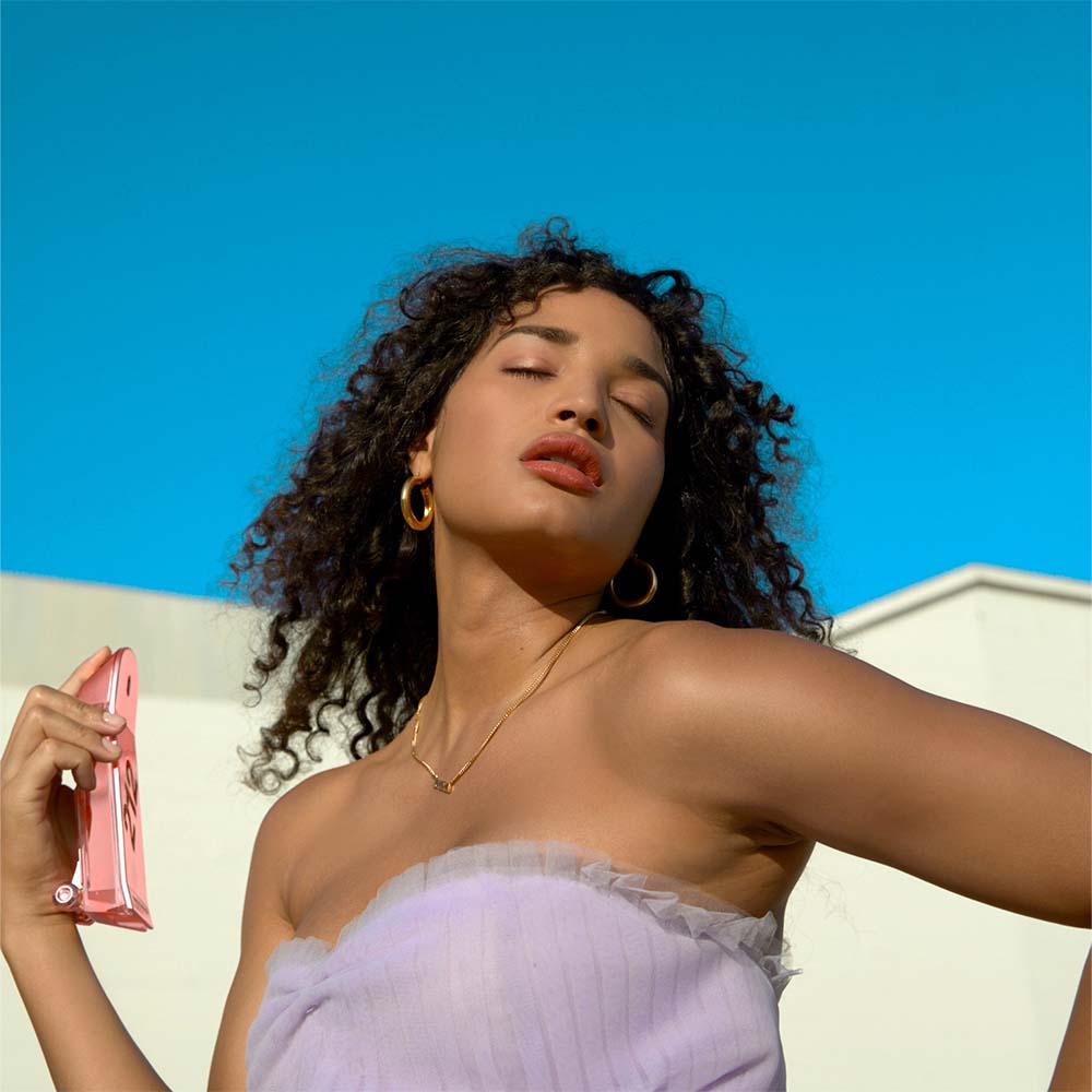 O frasco do perfume 212 Heroes For Her vem numa versão ultra sofisticada em tom dourado-rosé, fabricado de forma inovadora em vidro cromado. O skate é um forte símbolo de juventude, da liberdade, da feminilidade moderna e da autoexpressão.