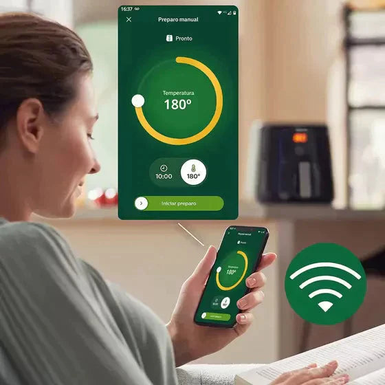 A refeição ficou pronta e surgiu uma reunião inesperada? Faltam só 10 minutinhos para terminar o episódio da sua série? Resolvido! Basta acionar, pelo seu celular ou pela sua assistente de voz, a função Manter Aquecido*, terminar o que está fazendo, e seu prato estará fresquinho te esperando! Tenha mais praticidade e liberdade no dia a dia! Está sem ideias do que preparar para o jantar? Não se renda mais ao delivery e nem se aborreça com a monotonia na cozinha! A AirFryer Connect conta com o APP NutriU, que possui uma variedade de mais de 200 receitas que te darão água na boca e garantirão uma refeição saborosa e saudável, de um jeito fácil! Escolha o que quer comer, seja guiado e controle, à distância, em tempo real. Ganhe mais horas para se dedicar ao que realmente importa! Inicie o preparo diretamente da fila do supermercado, do último exercício da academia, do estacionamento do shopping…