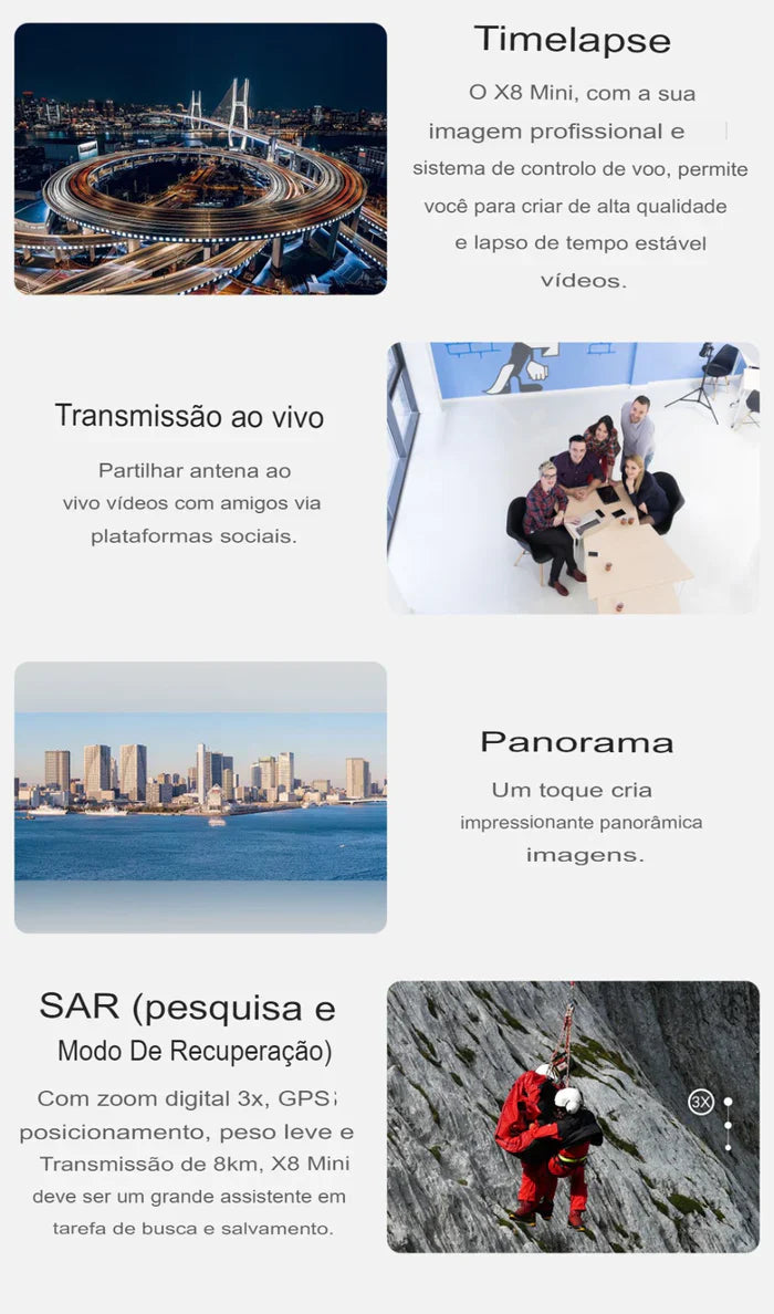 Com 10 canais de controle e recursos avançados, o FIMI X8 Mini é o parceiro perfeito para desencadear sua criatividade. Explore novas perspectivas, ângulos únicos e crie vídeos e fotos extraordinários.