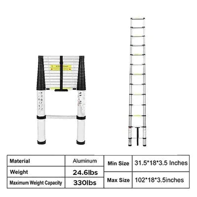 √ Leve: Feito de liga de alumínio de alta qualidade. É leve, pesando apenas 25,3 libras e é fácil de transportar sem sacrificar a força.A Escada Telescópica Multifuncional também é construída com materiais duráveis, incluindo alumínio de alta qualidade, que resiste a intempéries e ao desgaste diário. Isso significa que você pode usá-la por muitos anos sem se preocupar com problemas de manutenção ou desgaste excessivo. Com uma capacidade de peso de até 150 kg, você pode confiar nesta escada para suportar até mesmo as tarefas mais pesadas.