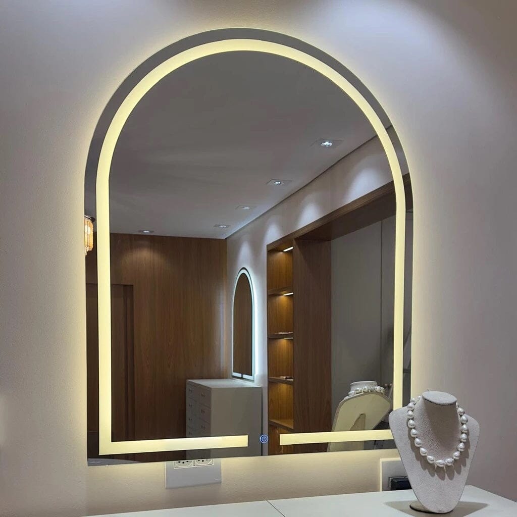 Esse espelho possui iluminação em LED jateado integrada na moldura, com 3 tons de luz (quente, neutra e fria), permitindo adaptar a atmosfera conforme o momento. O botão touch screen embutido garante praticidade e tecnologia em um único toque. Seu formato ovalado com arco suave valoriza tanto decorações clássicas quanto contemporâneas.