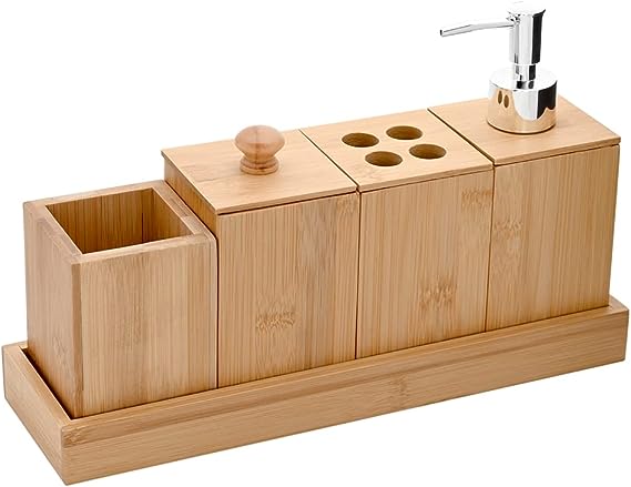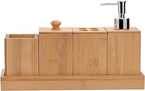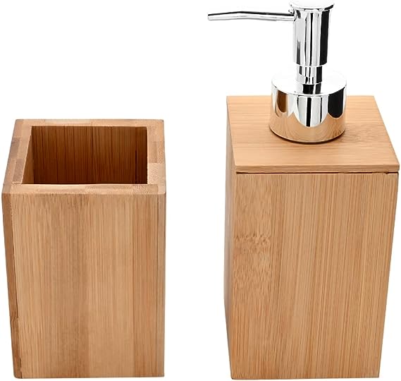 Feito em bambu de ótima qualidade, resistente, flexível e leve. Não absorvente, inodoro, sem sabor, sem substância tóxica e naturalmente antibacteriano. Suas fibras não possuem poros, não havendo acúmulo de resíduos. Este lindo kit inclui um suporte (30x9x3cm), um porta algodão (7,2x7,2x14cm), um porta creme dental (7,2x7,2x11cm), um porta escova (7,2x7,2x10,5cm) e um porta sabonete líquido (7,2x7,2x17,5cm) com capacidade de 125ml e pesa 930 gramas. Decore seu espaço com esse kit. O design elegante torna a escolha ideal para ambientes modernos. Este conjunto de acessórios adiciona charme atraente a qualquer banheiro. É adequado para residências, hotéis, escritórios e outros. A bomba do porta sabonete é capaz de lidar com líquidos espessos como condicionador denso, sabonete líquido, saboneteira e loções, além de conter uma junta à prova de vazamentos. Reutilizável, recarregável e ecologicamente correto para o meio ambiente. Basta água corrente e detergente. Para melhor limpeza, lave na água morna para soltar os resíduos de sabão. Coloque o tubo da saboneteira em um recipiente com água morna e deixe por alguns minutos e pronto, seu kit bambu estará higienizado