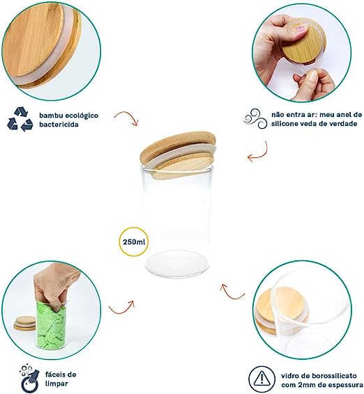 Esse é o conjunto de potes de vidro hermético redondo de 250ml para mantimentos com tampa de bambu. Não julgue pelas aparências, ele não é só um potinho bonito: com a combinação da vedação de silicone e o bambu antibacteriano, esse pote se torna um verdadeiro mestre na conservação de alimentos! E não é só de comida que vive esse pote: além de tempero, açúcar e sal, nele cabe purpurina, algodão, moedas, grãos, clipes, grampos, elásticos e outras pequenices que você quiser guardar - isso que é versatilidade.