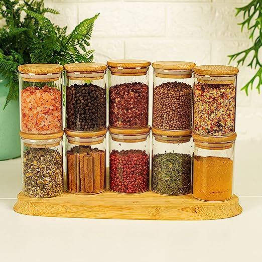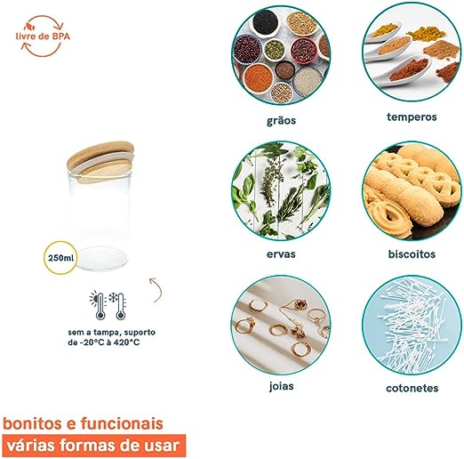 Esse conjunto contém:10 unidades - POTE DE MANTIMENTOS DE 250ML COM TAMPA DE BAMBU –  Altura: 10 cmDiâmetro: 6,5 cm
