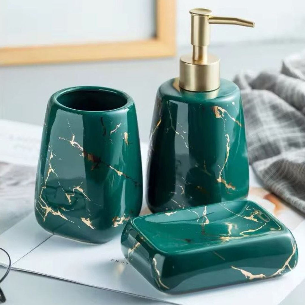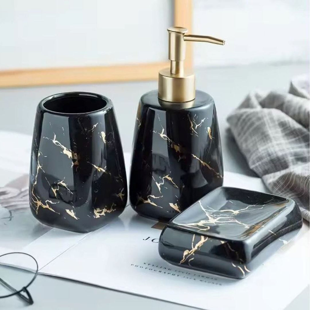 Este kit exclusivo inclui um dispensador de sabão líquido, um porta-sabonete em barra e um porta-escovas de dentes, todos feitos com materiais de alta qualidade que garantem durabilidade e resistência. O design moderno e as opções de cores como preto, cinza e dourado permitem que você personalize seu espaço, adicionando um toque de sofisticação e estilo.