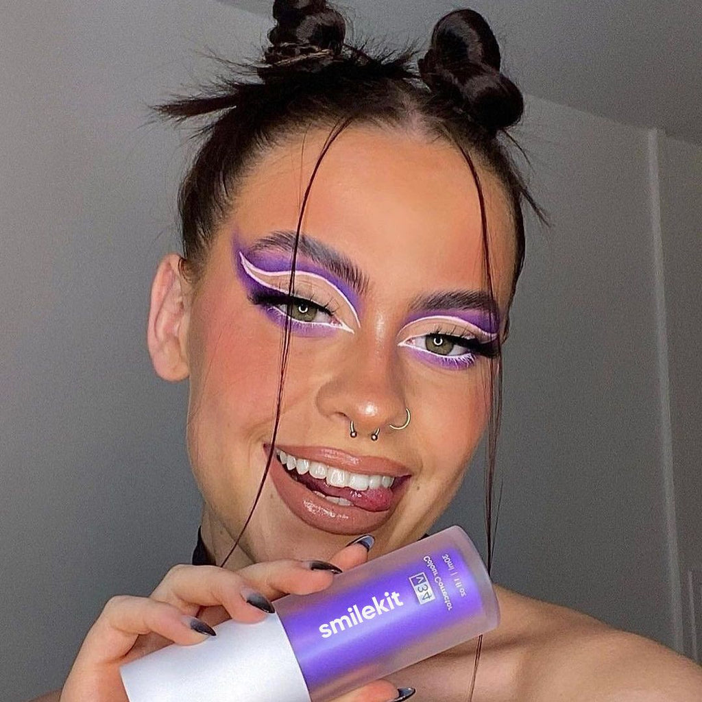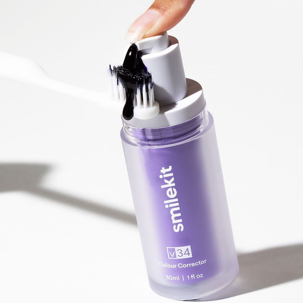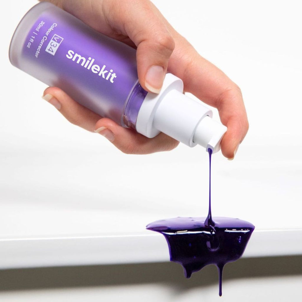 Aplicando o tom certo de roxo junto com a fórmula V.34 é possível neutralizar os tons amarelados dos dentes de forma imediata.