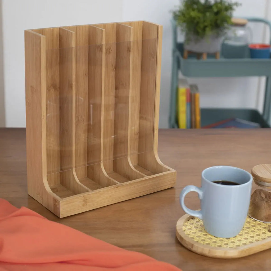 Porta Cápsula Vertical Bambu 🧡 Universal: Para todos os tipos de cápsulas (dolce gusto, nespresso, 3 corações…) Com 4 divisórias para separar e organizar melhor os sabores de cada cápsula! Medidas: Altura 30cm | Largura 25cm Material: Bambu e acrílico