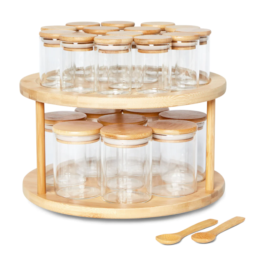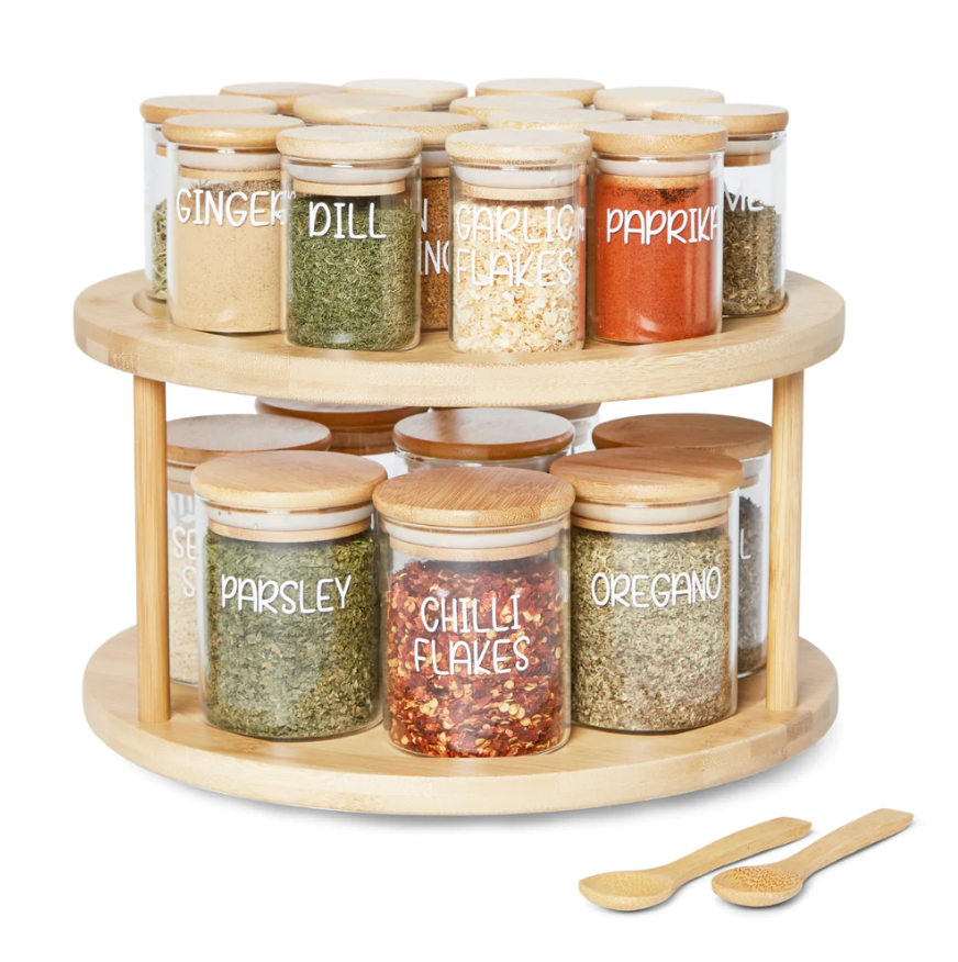 Maximize o espaço da sua dispensa com estilo com nosso conjunto grande de 2 camadas de bambu plataforma giratória e jarra de especiarias 22x. Ótimo para aqueles cantos ou lugares difíceis de alcançar.